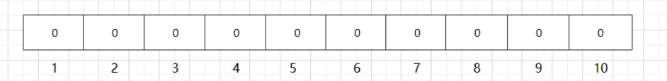 对于长度为 m 的位数组,在初始状态时,它所有位置都被置为0,如下图所示: