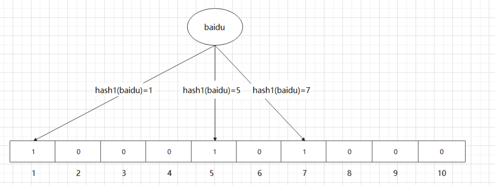 • 使用布隆过滤器中的哈希函数对元素值进行计算,得到哈希值(有几个哈希函数得到几个哈希值)