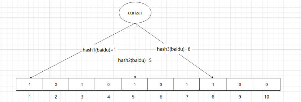 例如我们查询 “cunzai” 这个值是否存在,哈希函数返回了 1、5、8三个值