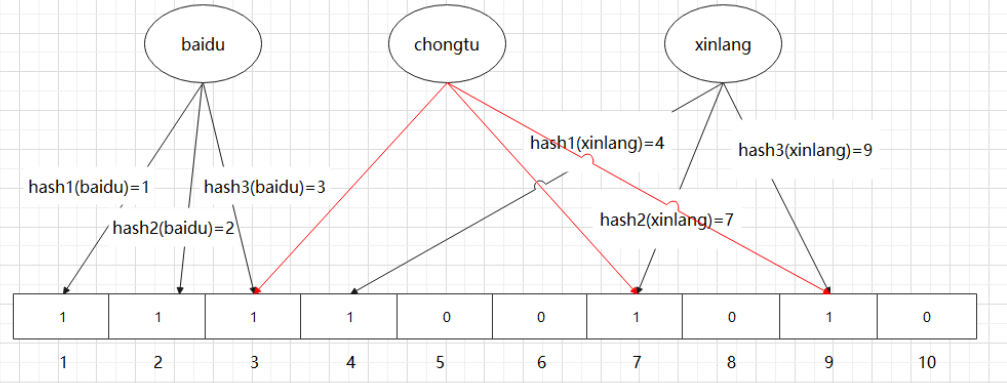 情况1:一个字符串可能是 “chongtu” 经过相同的三个映射函数运算得到的三个点跟 “xinlang” 是一样的,这种情况下我们就说出现了误判 情况2: “chongtu” 经过运算得到三个点位上的 1 是两个不同的变量经过运算后得到的,这也不能证明字符串 “chongtu” 是一定存在的。